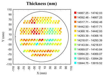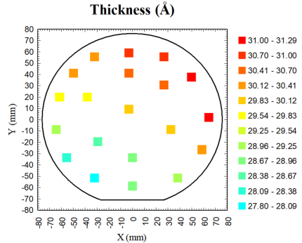 In combination with proprietary modeling algorithms, this additional information content allows the unambiguous characterization of unknown materials and multi-layer stacks. In Figure 3, a very thin 30 Å film is mapped over the wafer with a standard deviation of ~1 Å.