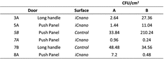 Table 2 details the total CFU/cm2 for various handles and push panels located throughout the school. There is a significant difference between the control and the coated iC-nano surfaces. The uncoated, control surfaces delivered a far higher CFU count per unit area compared to the coated handles.