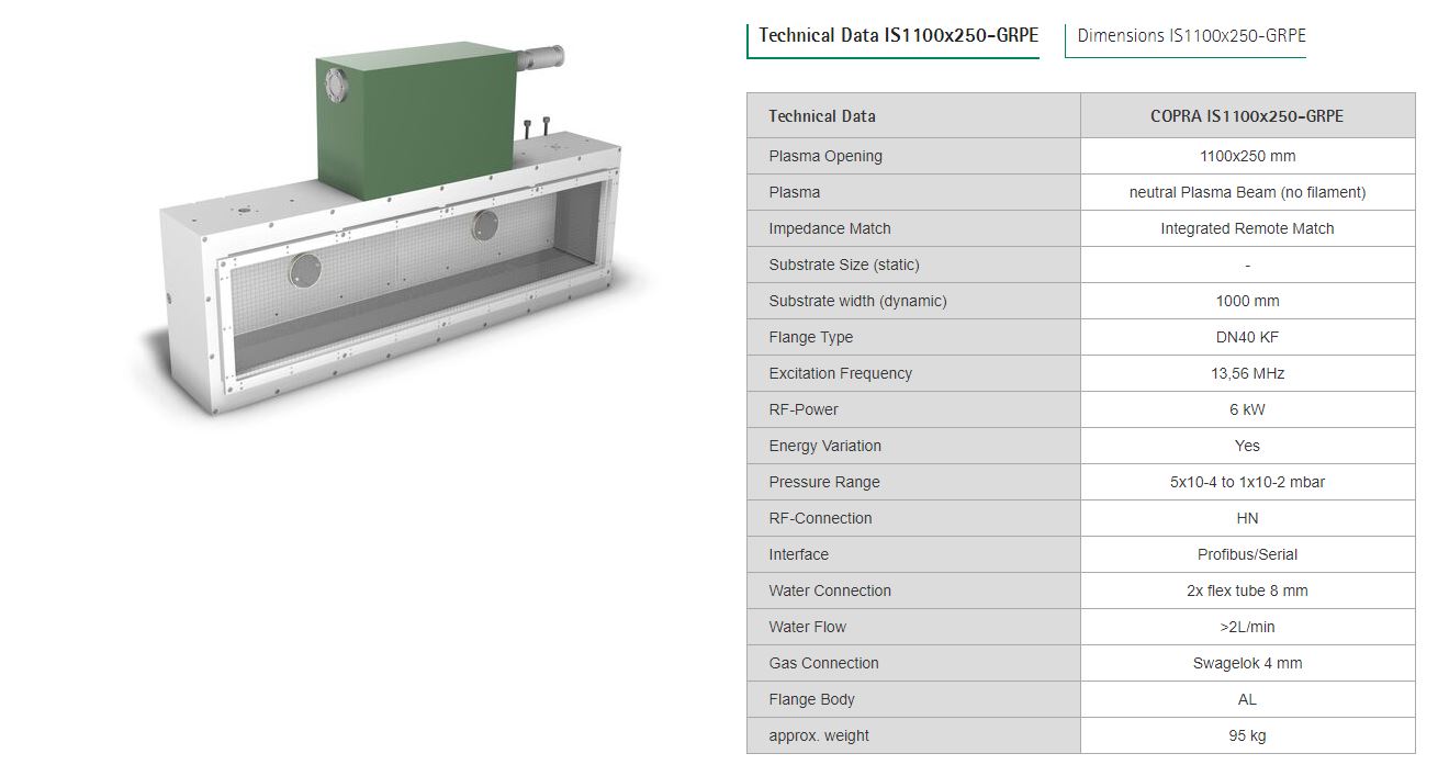 The COPRA IS1100x250-GRPE Built In Plasma Source have from the origin been designed for the assist of nearly any kind of PVD deposition processes.The unique design allows you also to integrate the COPRA IS1100x250-GRPE Built In Plasma Source completely inside vacuum in your existing Inline- or R2R-Coater in order to e.g. pre treat or oxidize your substrates. The COPRA IS1100x250-GRPE Built In Plasma Source is also easy to scale in size and power if requested. Please see the IS-custom design site.