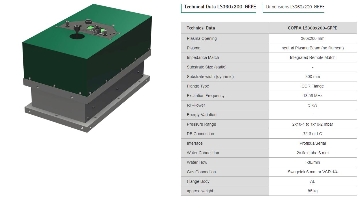 The CCR Technology COPRA LS360x200-GRPE Linear Plasma Source is designed for PVD-Assisted DLC coating processes as also fast substrate cleaning and activation processes on substrate widths of up to 300 mm. The COPRA LS360x200-GRPE Linear Plasma Source solutions for batch PVD drum/tool coaters are state of the art Sputter Assist solutions with benchmarking post oxidation performances for high quality and productivity markets. The exceptional post oxidation properties are gaining increasing market interest for precision optical coating applications with high throughput requirements where magnetron sputtering solutions are gaining more and more market. These LS sources in a reactive sputter set up do also increase the densification of your film providing a better stoichiometry of it thus enabling high quality decorative coatings. The COPRA LS360x200-GRPE Linear Plasma Source are typically installed in mixed PVD/PECVD coater setups where you have movable substrates as i.e. vertical or horizontal batch/or inline coaters.