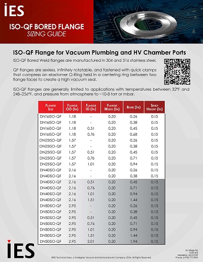 ISO-QF flanges are generally limited to applications with temperatures between 32°F and 248–256°F, and pressure from atmosphere to ~10-8 torr or mbar.
